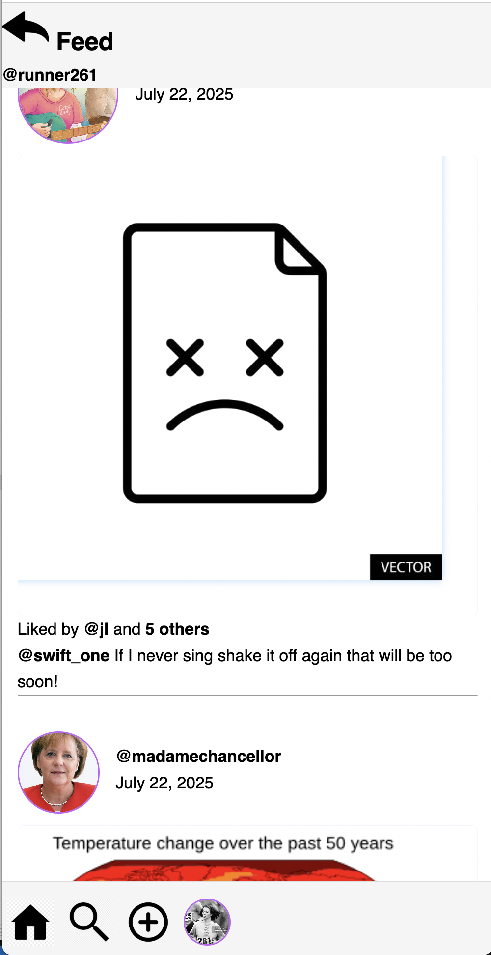 Change the “home” navigation link (e.g., the leftmost navigation icon in the example) from the bottom of the page so that it links to the post feed.